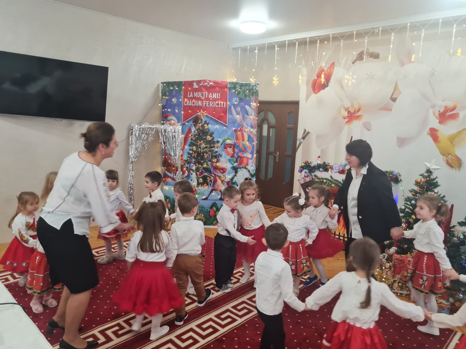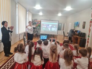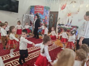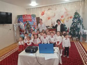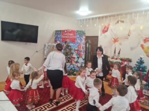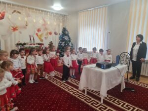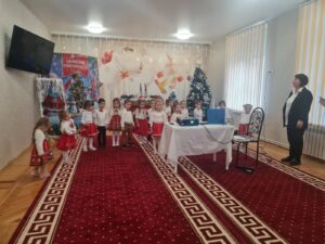 Cele  mai frumoase sarbatori de iarnă se apropie cu pasi repezi si, deja, simtim spiritul lor prin aroma imbietoare de cozonac, prin Pomul de Crăciun incarcat cu dragoste, pace si voie buna si, desigur,  prin emotiile micutilor din grupa  mijlocie, Gradinița nr.62, municipiul Chişinău, care vin  sa transmita un SALUT  tocmai peste PRUT, copiilor, cadrelor didactice de la Şcoala Gimnazială ,, George Bacovia”, Bacău, director Prof. Vițalaru Lăcrămioara- Nicoleta, prin cantec, dans, colind si poezie.